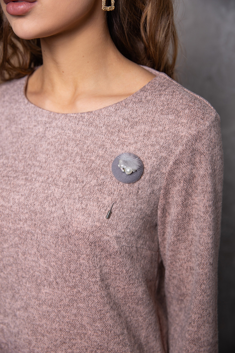 Блузка из трикотажного меланжевого полотна. Низ блузки декорирован притачным воланом со сборкой из полупрозрачного шифона. Перед с нагрудными вытачками, декорирован съемной брошью. Спинка со средним швом и вырезом капелькой у горловины, рукав втачной. Вырез горловины округлый. Низ изделия асимметричный.